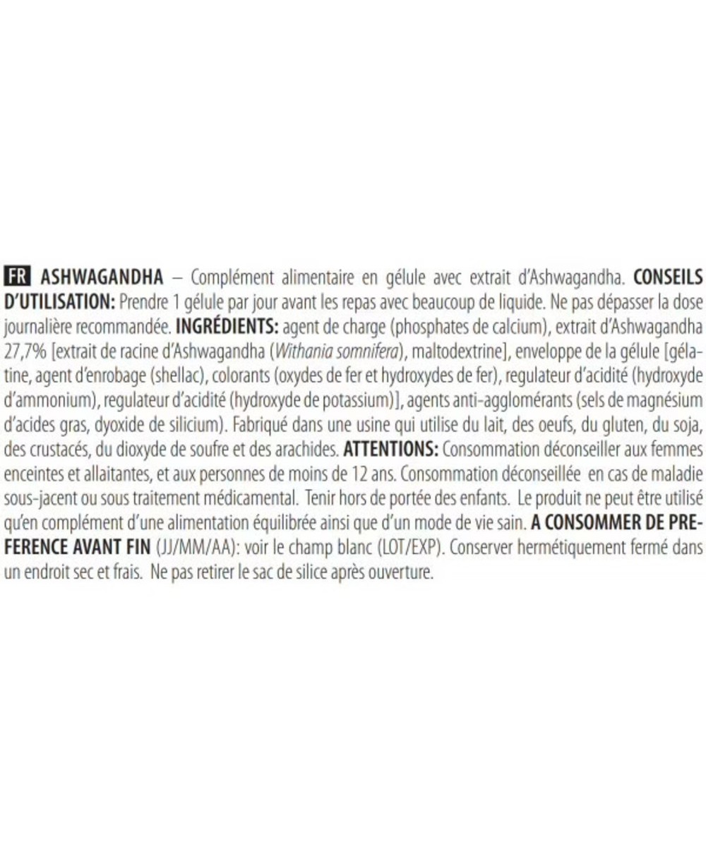 Agent de charge (phosphates de calcium), extrait d’Ashwagandha 27,7% [extrait de racine d’Ashwagandha (Withania somnifera), maltodextrine], enveloppe de la gélule [gélatine, agent d’enrobage (shellac), colorants (oxydes de fer et hydroxydes de fer), regulateur d’acidité (hydroxyde d’ammonium), regulateur d’acidité (hydroxyde de potassium)], agents anti-agglomérants (sels de magnésium d’acides gras, dyoxide de silicium).
