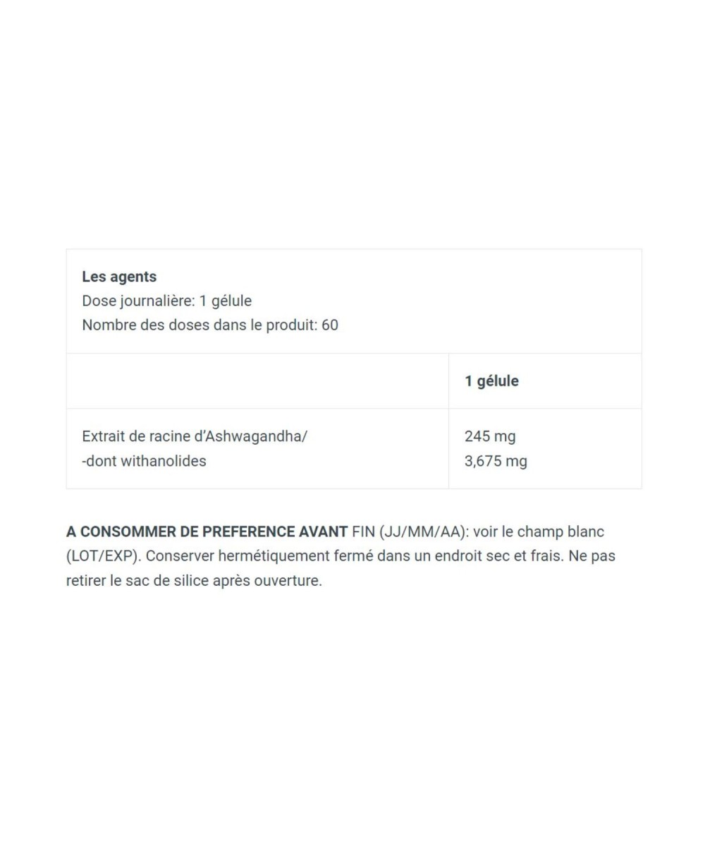 La portion (1 gélule) de BioTechUSA Ashwagandha contient 245 mg d’extrait de racine d’ashwaganda, avec une teneur en 3,675 mg de vitanolides.